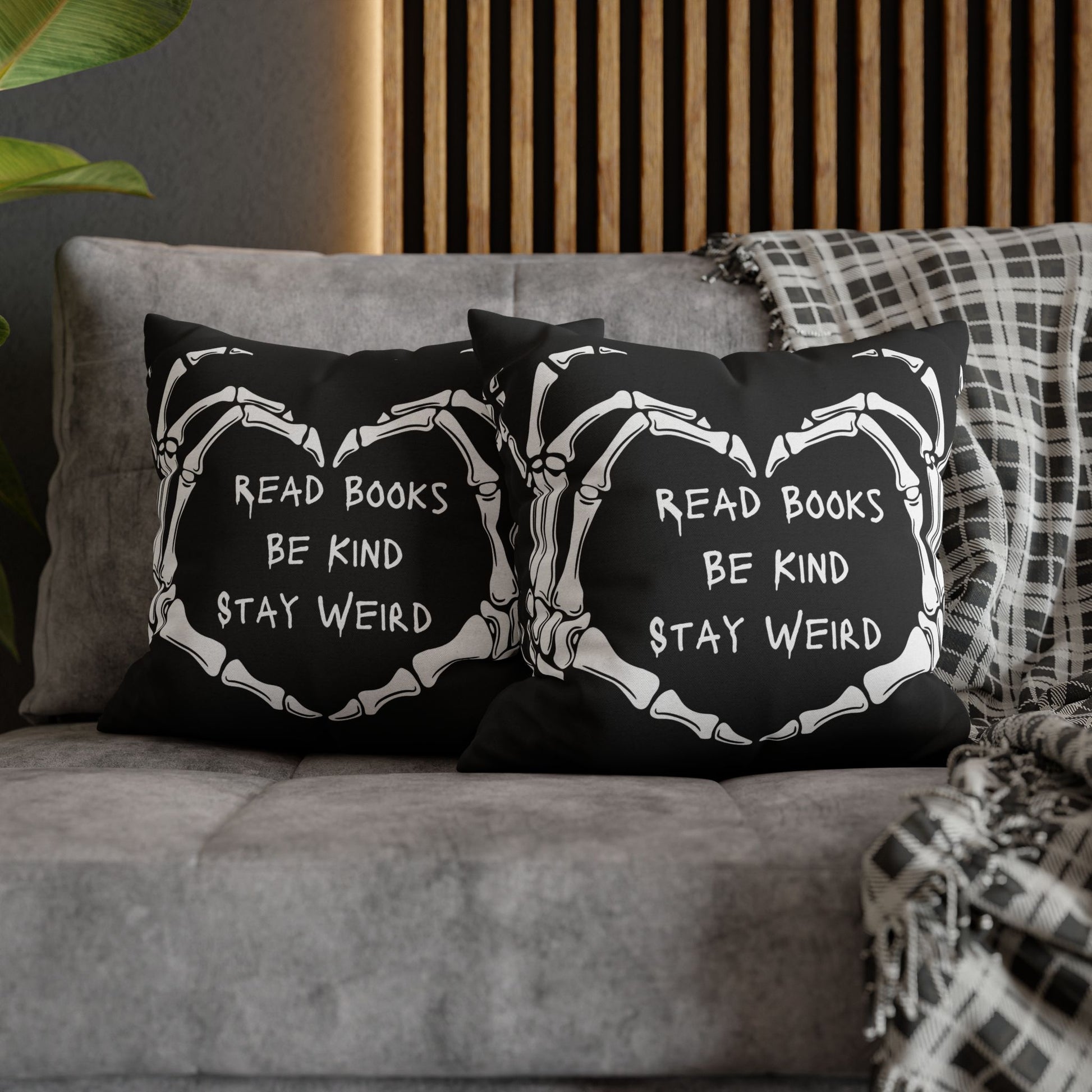 A bold, black square pillowcase that speaks to bookish, offbeat souls. White skeletal hands form a heart around the handwritten slogan: “Read Books, Be Kind, Stay Weird.” The double-sided print keeps that crisp, monochrome look from every angle, while the spun polyester fabric stays smooth and wrinkle-free so the design always reads clearly. Tuck it onto a favorite toss pillow on your reading nook or layer it on a bed with textured throws to add a little gothic whimsy and a quiet reminder to prioritize curiosity, compassion, and individuality.